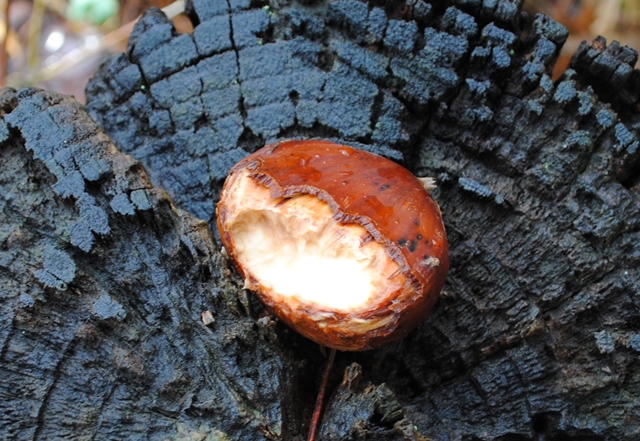 山のなかに一本の切り株がある。 どうやらその切り株はリスのテーブルのよう。 私たち人間が来てびっくりしたのか? テーブルには今まで食べていた栗のみの食べかけがった。 かわいらしいりすの姿を眺めてみたかったな~